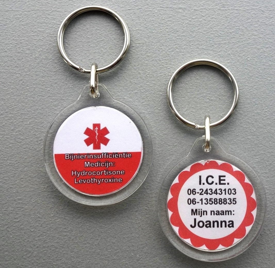 Sleutelhanger met medisch teken en 4 tekstvelden aan de voorzijde en ICE en naam achterzijde. Voorzijde is verkrijgbaar in het rood of in het blauw. Dit is betreft het medisch teken en achterzijde tekstvelden.