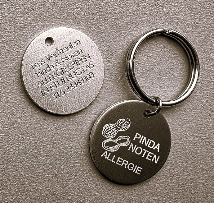Medische sleutelhanger/tassenhanger rond stevig aluminium gegraveerd 2-zijde gravure, incl. RVS sleutelring, voorzijde allergie naar keuze, achterzijde 5 regels tekst, diepe gravure. Hieronder de keuze in allergie Nederlands of Engels gegraveerd.