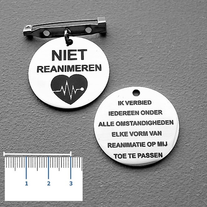 (Bij onze medische artikelen hebben wij in de groep niet reanimeren ook een kleine rvs penning (18mm) aan (15mm speldje) € 9,95. Deze is bijvoorbeeld wel geschikt aan een bh.)