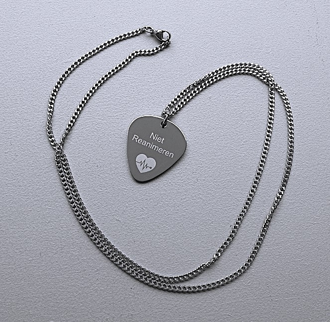 Niet reanimeren penning guitar pick aan RVS schakel of balletjes ketting. De penning is dubbelzijdig gegraveerd. U kunt kiezen om de penning dubbelzijdig te graveren met het hartslagteken en de tekst niet reanimeren. Ook kunt u kiezen voor 4 regels tekst aan de achterzijde.