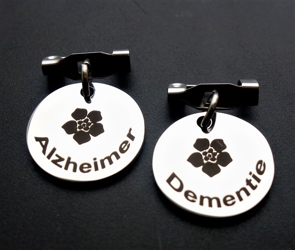 Nieuw in ons assortiment Alzheimer/Dementie bedel dubbelzijdig RVS aan een rvs speldje klein. Maat speldje 1,5 cm.