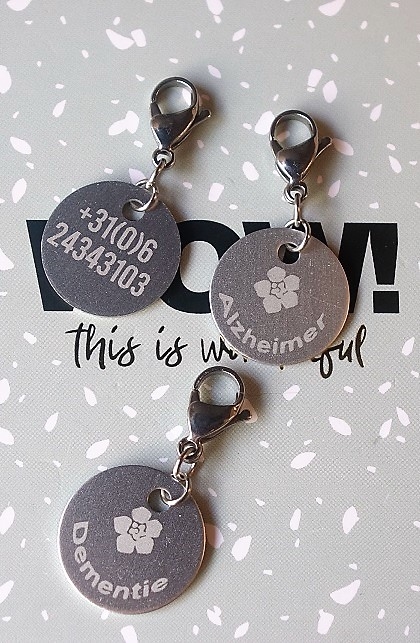 Nieuw in ons assortiment Alzheimer/Dementie bedel aluminium aan een rvs slotje groot. Op de achterzijde kunt u 1 telefoonnummer kwijt. Deze kunt u ook aan een kralenarmband bevestigen. Voor een meerprijs van € 1,-- kunt u ook een armbandje neopreen op uw maat bijbestellen. In leuke kleuren te verkrijgen.