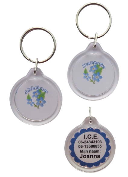 Medische sleutelhanger ALZEHEIMER of DEMENTIE vergeet mij niet bloemetjes en ICE achterzijde.