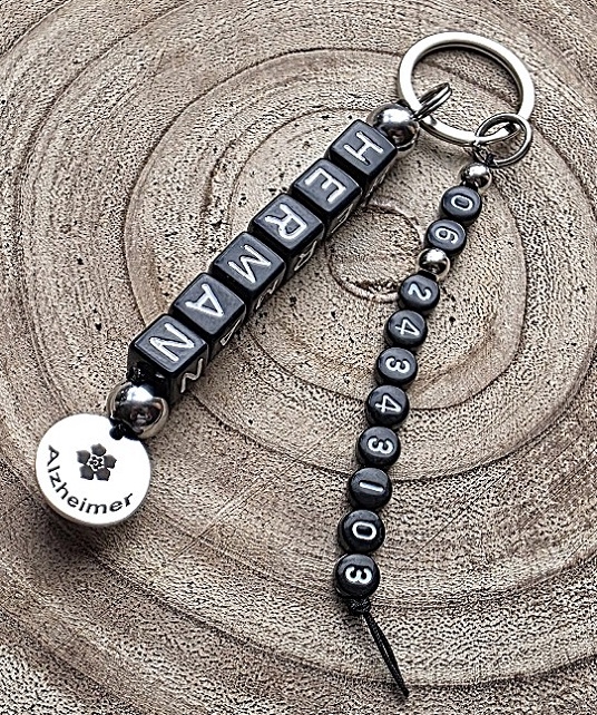Sleutelhanger met naam en RVS bedel Alzheimer of dementie en telefoonnummer. Voor een meerprijs van € 2,-- kunt u ook twee telefoonnummers aan deze sleutelhanger laten maken.