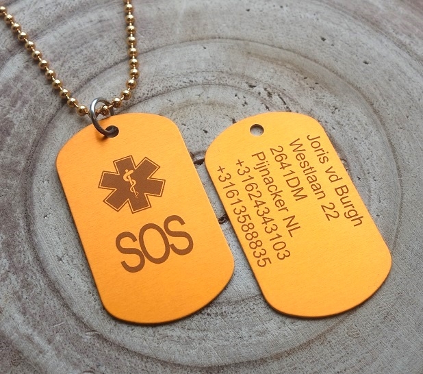 Het identiteitsplaatje is gemaakt van aluminium. Het universele kogelkettinkje zal bij te hoge belasting breken, dus is veilig voor jong en oud. U kunt kiezen uit  3 kleuren tags. Ook sleutelring mogelijk!