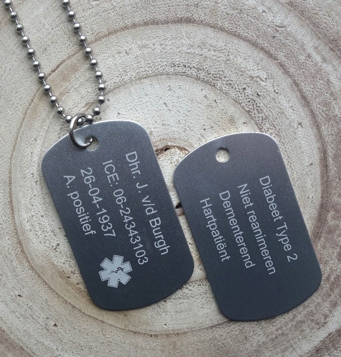 Dogtag met klein gegraveerd medisch teken 2-zijde gravure. Hier is het lettertype wat groter.