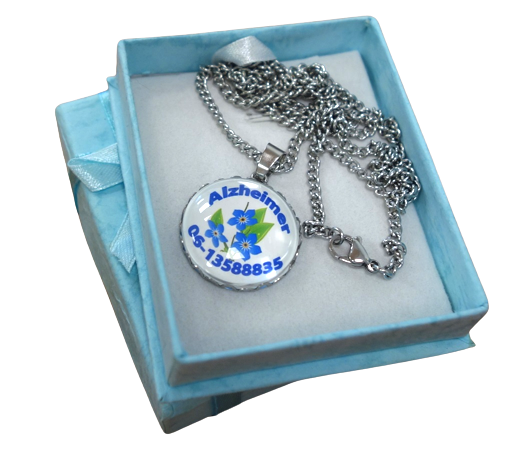 Mooie RVS hanger en ketting, verkrijgbaar in twee uitvoeringen: Alzheimer of Dementie met een ICE telefoonnummer.