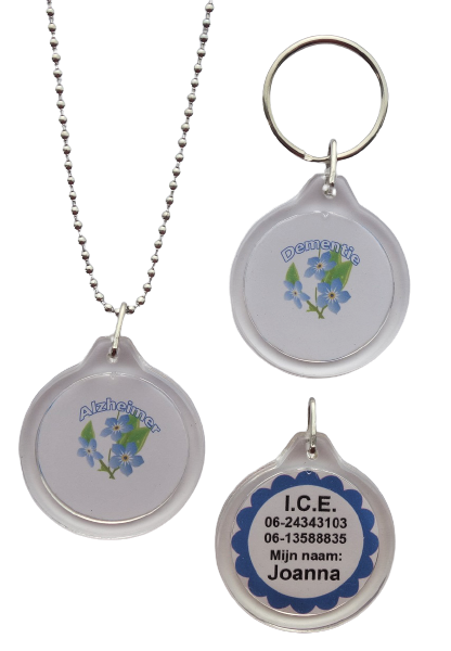 Voorzijde keuze Alzheimer of Dementie met vergeet mij nietjes. Aan de achterzijde kunt u een naam en twee telefoonnummers kwijt. Mag ook een andere tekst zijn.