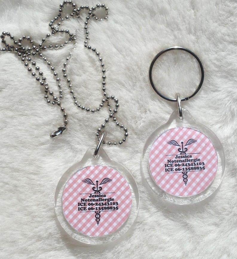 Bescherm uw kind of uzelf met deze handige ID lichtgewicht ketting. Deze kunt u als ketting of als sleutelhanger bestellen. Dubbelzijdig beide kanten hetzelfde, 4 regels tekst mogelijk á 15 tekens per regel. In de groep medische buttons kunt u dit ontwerp ook als button bestellen.Vanaf 12 jaar raden wij een RVS balletjes ketting aan, deze blijft altijd mooi, ook bij zweten.