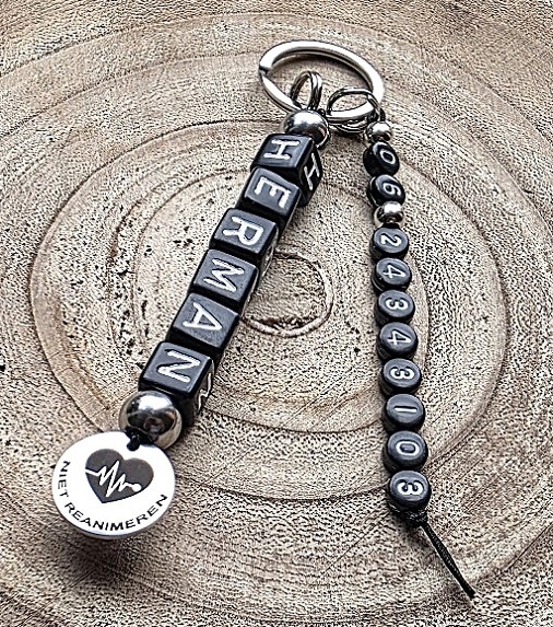 Sleutelhanger met naam en RVS bedel Niet Reanimeren en telefoonnummer. Voor een meerprijs van € 2,-- kunt u ook twee telefoonnummers aan deze sleutelhanger laten maken.