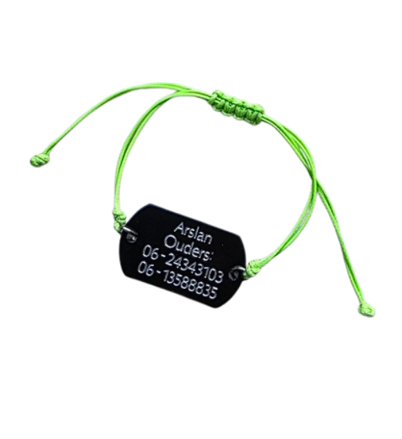 Armband onuitwisbaar gegraveerd met tekst naar keuze. Dit is een mini dogtag in zwart. U kunt op deze armband kwijt: 4 regels tekst kwijt á 11 tekens per regel. Meer past er echt niet op!!!