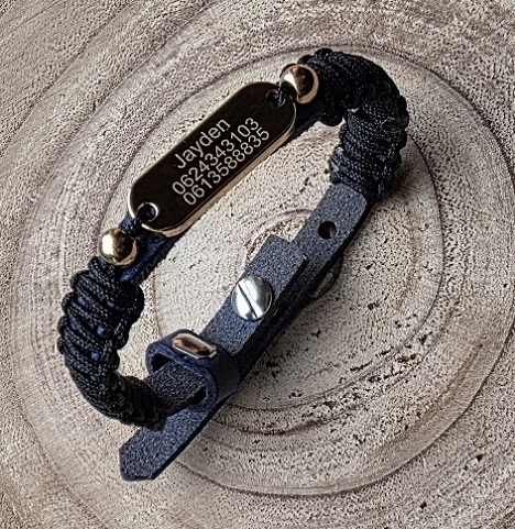 SOS armband voor kinderen of volwassenen gegraveerd met tekst naar keuze, kleur tag is goud. Maat gouden tag: breedte 3cm bij 1cm hoog. MAAT: vanaf polsmaat rondom opgemeten 13cm tot en met polsmaat 17,5cm.