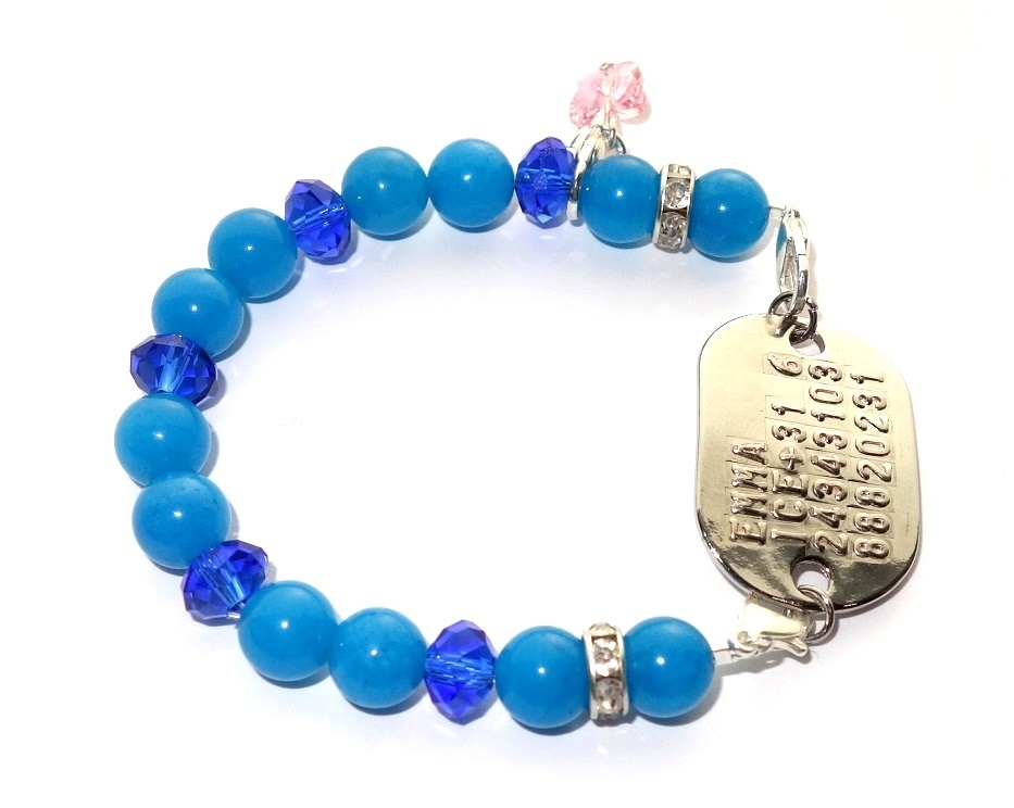 Armband met zilverkleurig plaatje onuitwisbaar geponst met tekst naar keuze. U kunt op deze armband kwijt 4 regels tekst á 8 tekens per regel. Armband is geregen op staaldraad en gaat dicht met een zilverkleurige slotjes. Dit is is verband met de veiligheid. Is uw kind boven de 10 jaar? vermeld dit in het opmerkingen veld. Wij maken de armband dan met RVS slotjes. Aan de armband zit een kristallen bedel met vlinder.
