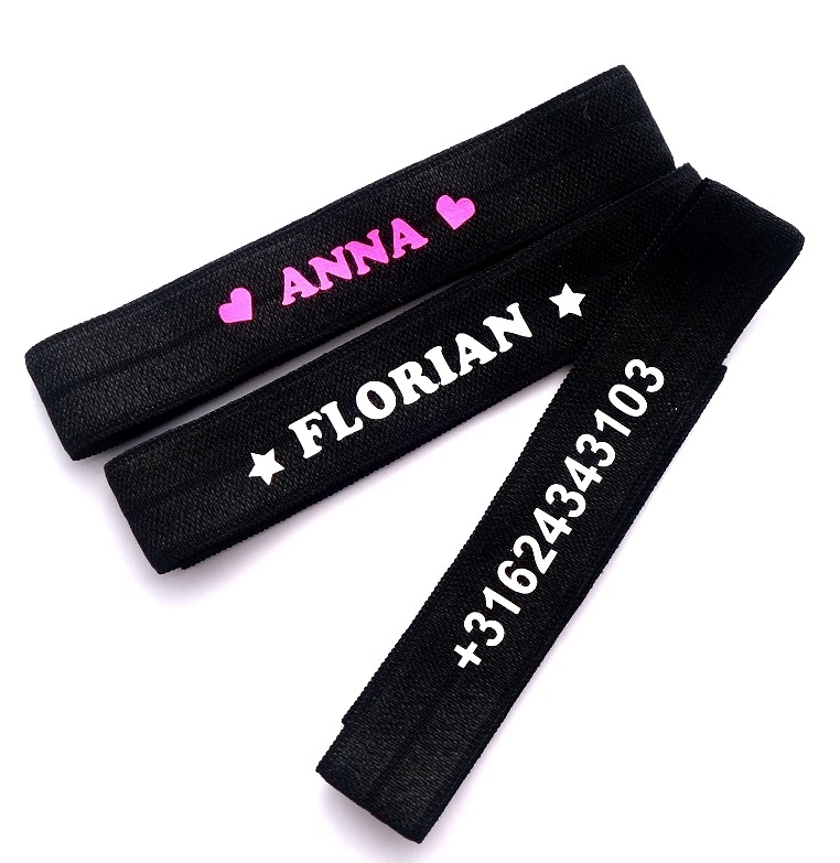 Nieuw in ons assortiment: stoffen polsbandje elastische glansstof voor kleine kinderen met naam aan de voorzijde en telefoonnummer op de achterzijde bedrukt. Deze bandjes kunt u zelfop maat knopen en afknippen. De stof is rekbaar en is makkelijk van de pols af te schuiven. Door de zachtheid van de stof zeer geschikt voor een jonge leeftijd.