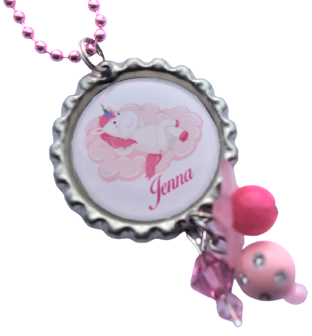 De hanger (2,5 cm) is versierd met een jade kraal, swarovski bicone kralen en een bloem en glitterkraal van acryl. De kleuren van de kralen worden aangepast aan het gekozen ontwerp van de hanger, maar zullen veelal zijn zoals in het voorbeeld.