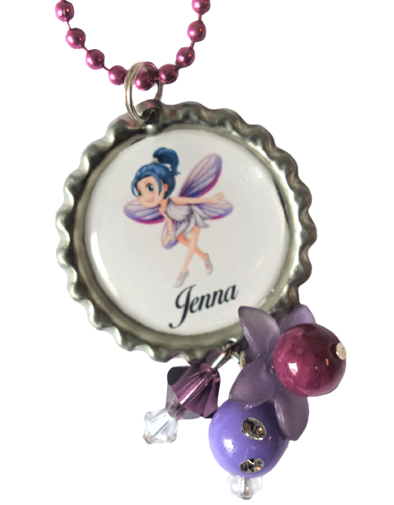 De hanger (2,5 cm) is versierd met een jade kraal, swarovski bicone kralen en een bloem en glitterkraal van acryl. De kleuren van de kralen worden aangepast aan het gekozen ontwerp van de hanger, maar zullen veelal zijn zoals in het voorbeeld.