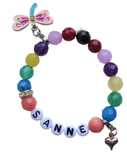 De kinderarmband Joviaal is handgemaakt met verschillende soorten edelstenen o.a. carneol, amethist, avondturijn, citrien etc. op elastiek.