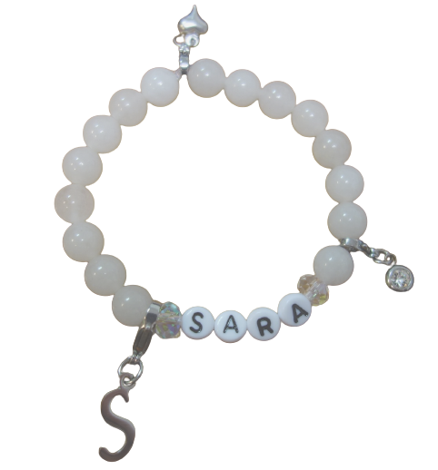 Het voorbeeldmodel is gemaakt met jade wit. De kristalen kralen naast de naam worden aangepast aan de keuze edelsteen die u kiest.