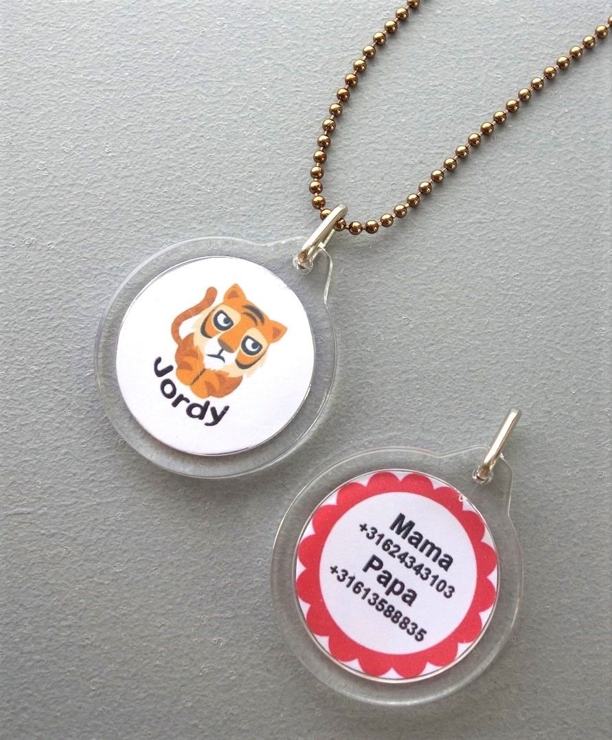 Origineel, hip en uniek zijn deze leuke kinder kettingen met naam en vier tekstvelden op de achterzijde naar keuze. Handig voor een dagje weg met de kinderen! Deze schattige ketting wordt geleverd met een bolletjes ketting of sleutelring naar wens. Maat doorsnee hanger 3,5 cm.