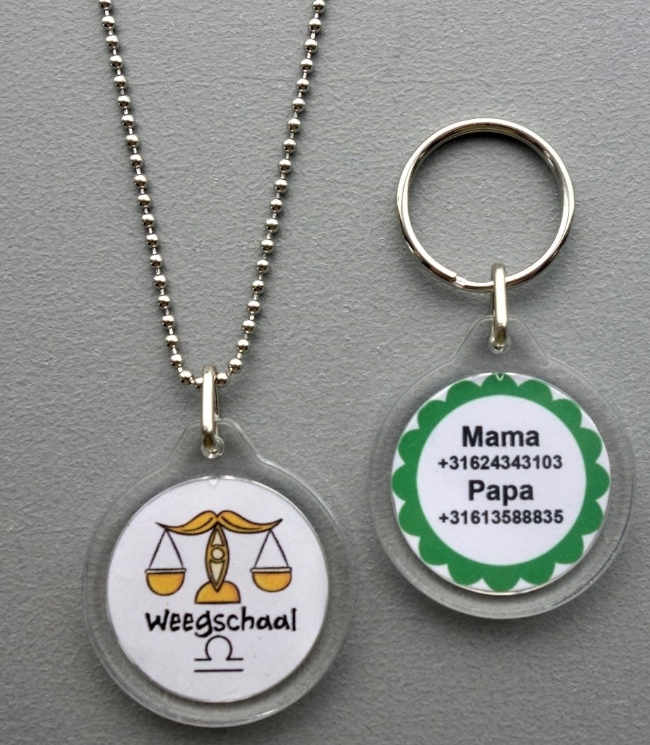 Origineel, hip en uniek zijn deze leuke kinder kettingen met sterrenbeeld en vier tekstvelden op de achterzijde naar keuze. Handig voor een dagje weg met de kinderen! Deze schattige ketting wordt geleverd met een bolletjes ketting of sleutelring naar wens. Maat doorsnee hanger 3,5 cm.