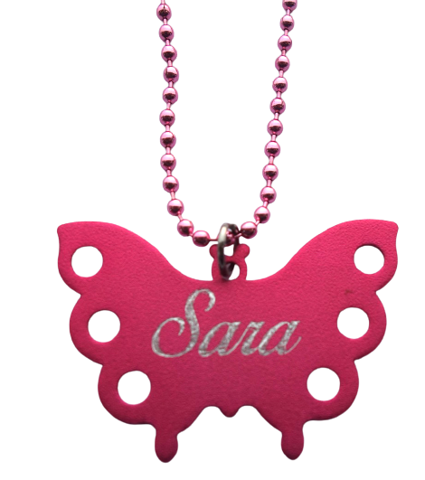 De prijs voor de naamhanger vlinder ALUMINIUM  is inclusief balletjes ketting.  Verkrijgbaar in de volgende kleuren: rood, turqoise en roze.