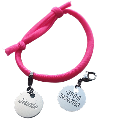 Bedel aluminium met naam voorzijde en telefoonnummer op de achterzijde. U kunt ook een koordje neopreen armbandje op maat gemaakt bijbestellen meerprijs € 1,--