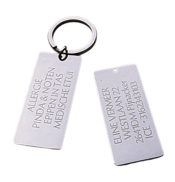 Voor de meerprijs van € 1,50 kunt u ook een medische rvs bedel aan de sleutelhanger laten bevestigen. Deze hebben wij in RVS zilver of RVS goud in voorraad.