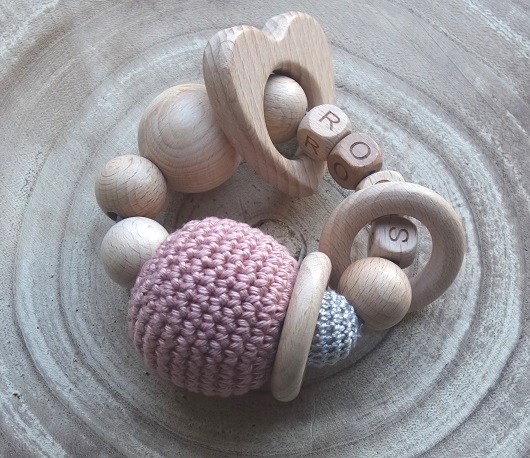 Deze handgemaakte rammelaar/bijtring met houten beuken kralen, houten letterkralen, beuken kralen omhaakt, houten ringen en met houten dier zijn verkrijgbaar in roze of blauw combinatie. De bijtring keuze: vis, olifant, vogel, uil, auto, hobbelpaard, hart en bloem. In die kleuruitvoeringen verkrijgbaar. De grootste kraal is een gehaakte kraal met zachte vulling.