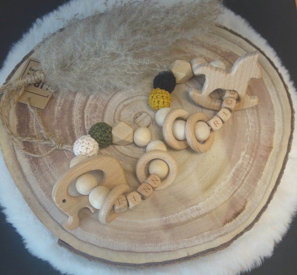 Deze handgemaakte rammelaar/bijtring met houten beuken kralen, houten letterkralen, beuken kralen omhaakt, houten ringen en met houten dier zijn verkrijgbaar in 5 kleurcombinaties.