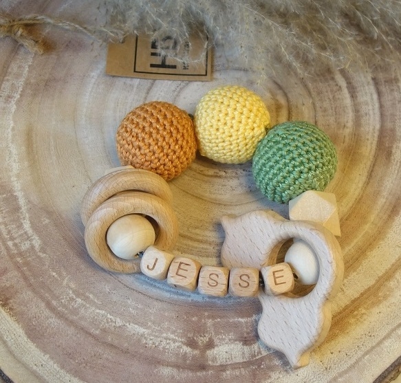 De rammelaar is gemaakt van ongelakt beukenhout en is splintervrij. Wilt u de bijtring zonder naam? geef het aan in het opmerkingen veld.