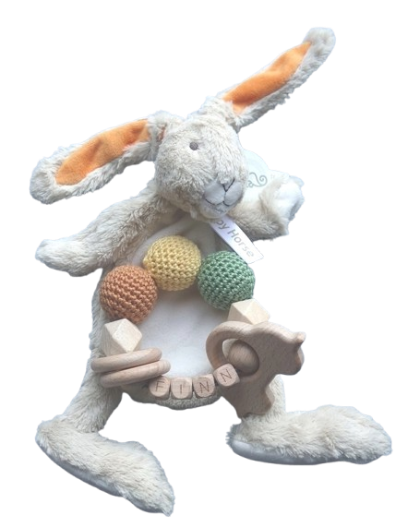 Bijtring grote beukenhouten kralen omhaakt bijpassede kleuren knuffeldoekje.