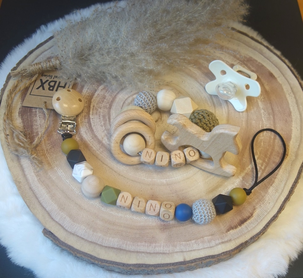Wij hebben hier een bijpassend speenkoord bedacht. Wilt u de bijtring en/of speenkoord zonder naam? geef het aan in het opmerkingen veld.