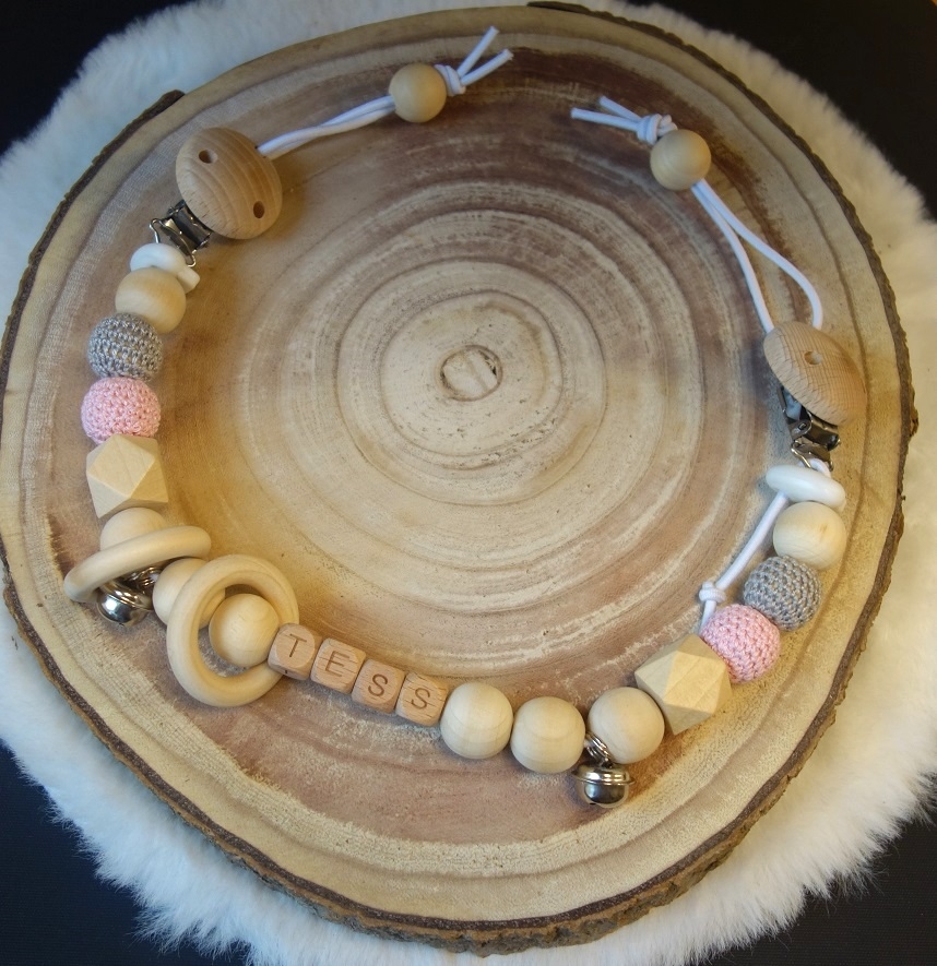 Kleur: houtkleur en hout omhaakte kralen in roze/grijs of lichtblauw/grijs tinten
