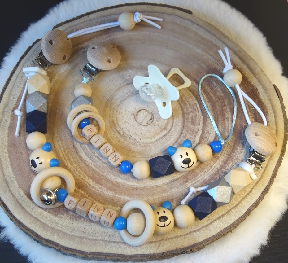 Wagenspanner beer en houten kralen en bijpassend speenkoord in roze of blauwe uitvoering