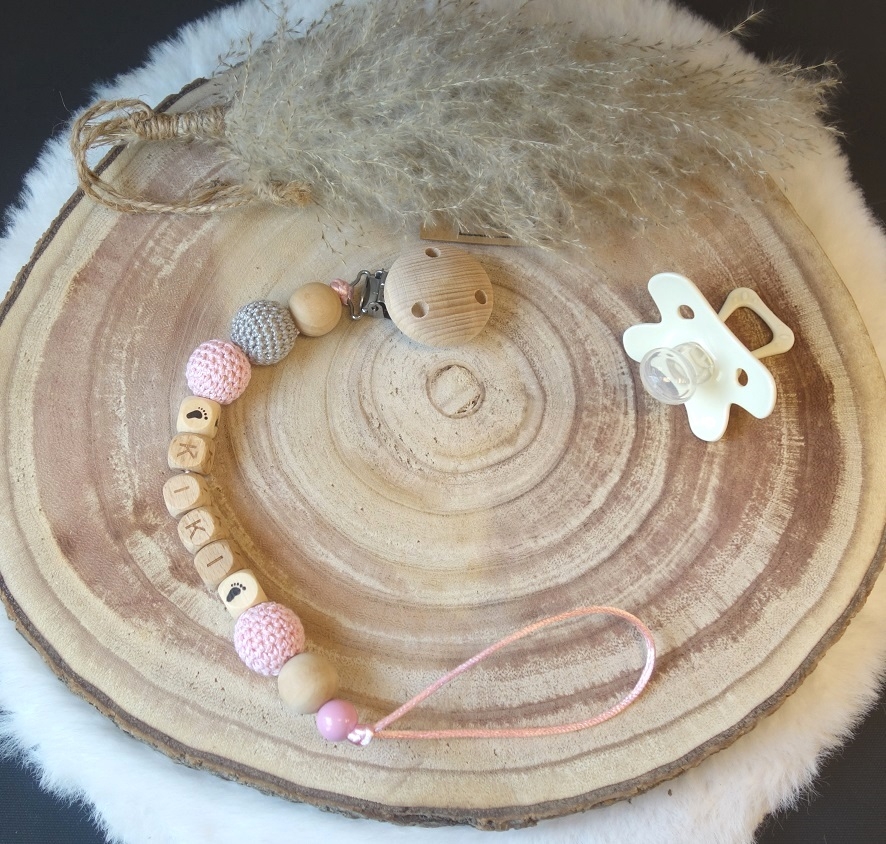 Bij de opties kunt u kiezen voor het speenkoord met naam wat u het leukst vindt. Wij hebben dit speenkoord met haakkralen, houten kralen en houten clip in 2 kleurencombinatie's roze of blauwe uitvoering, zie optie voor de keuze.