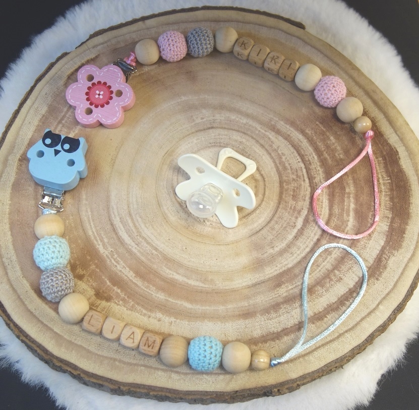 Bij de opties kunt u kiezen voor het speenkoord met naam wat u het leukst vindt. Wij hebben dit speenkoord met haakkralen in een roze en blauw uitvoering met diverse clips voor jongens en meisjes op voorraad: hart, bloem, vos uil en kat. Ook kunt u kiezen voor een effen houten clip.