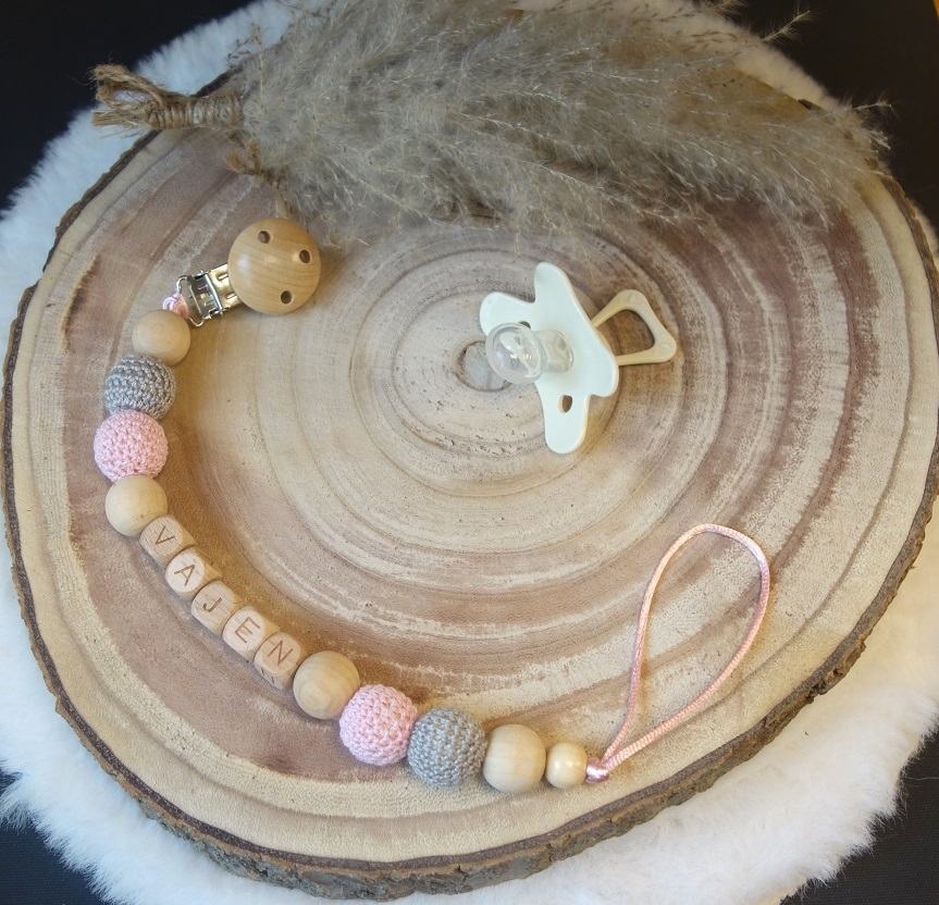 Speenkoord met naam haakkralen en houten kralen in babyroze of babyblauw