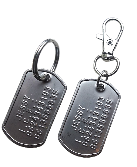 De prijs voor het identiteitsplaatje mini is inclusief RVS kleine sleutelring of RVS draaihaakje, handig voor aan het hondentuigje te bevestigen.
