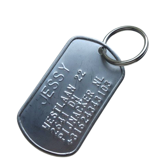 De prijs voor het identiteitsplaatje is inclusief ketting 13cm, clip, rubberen silencer en sleutelring.
