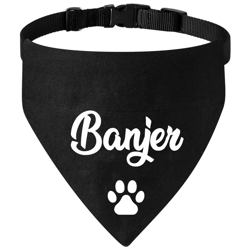 Halsbandbandana bedrukt met naam en afbeelding naar keuze: hondenpoot, allemaal kleine pootjes, allemaal kleine botjes of naam in bot. Zie optie voor keuze en afbeelding. Voorbeeldmodel lettertype back to black, u kunt kiezen voor een lettertype naar keuze.