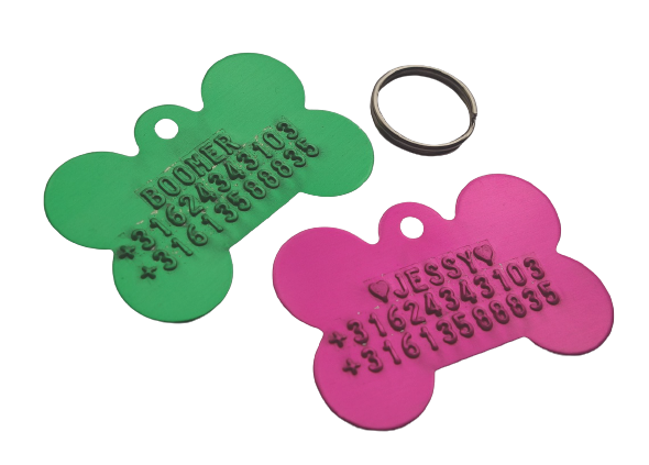 Uw hond of kat, het formaat is kleiner dan een gewoon identiteitsplaatje en past makkelijk aan de halsband van uw dier, bij vermissing is uw huisdier snel bij u terug.