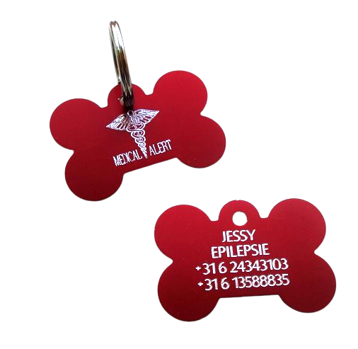 Hondenpenning bot medisch aluminium gegraveerd incl. RVS sleutelring, voorzijde medisch teken, achterzijde 4 regels tekst. Maak deze tekst niet te lang, de tekst wordt dan kleiner. Diepe gravure.