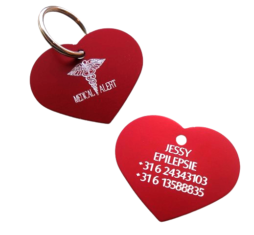 Hondenpenning hart medisch gegraveerd aluminium dubbelzijdig diepe gravering