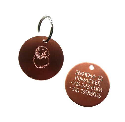 Hondenpenning rond messing of rose koper gegraveerd met afbeelding naar keuze incl. RVS sleutelring, voorzijde afbeelding, achterzijde 3 of vier regels tekst. Diepe gravure. Maat doorsnee penning 3,1cm. Stevige kwaliteit.